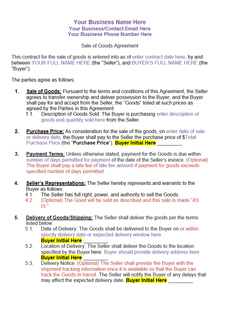 A sales of goods contract template is a legal document which is used to exchange goods, services or property from seller to buyer, upon an agreed amount of money with condition to be paid or the promise to pay. Generally, it is a legal draft which is used when a seller is all set to be ready for the selling of goods and services. A sales of goods contract template can also be prepared when companies or individuals sign a deal for exchange of goods against goods. In the right way, sales contracts are always established between buyers and sellers for the sake of sales/purchase of goods. With goods there are various items that can be bought or sold, just like; inventories, properties, equipment, services, tools and devices. Well, here in a sales contract one thing that is extensively explicit is the statement of terms and conditions. Rather than that, when a buyer signs such a contract, obviously he/she will first be satisfied with all the major milestones of such a contract, then he/she’ll make sure of the value of the sale, its price and term of payment as well.